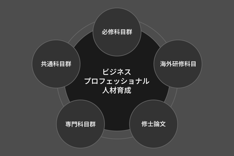 必修5科目(10単位)で経営に関する基礎知識及びスキルを養います。また論文演習Ⅰ・Ⅱ(4単位)にて学習の集大成として論文を執筆します。これら以外の科目については、約140科目の多彩な科目の中から、自らの指向性に併せて幅広く選択が可能です。また、グローバル人材育成のための体制も毎年強化しており、海外の企業や大学を訪問する海外研修科目も複数開講しています。