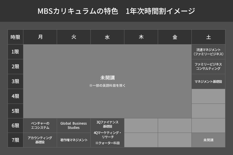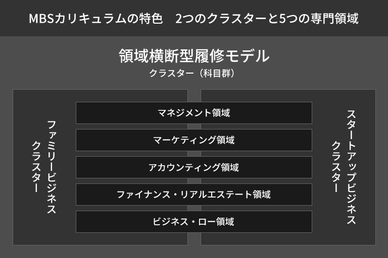 実務に必須となる「マネジメント」「マーケティング」「アカウンティング」「ファイナンス・リアルエステート」「ビジネス・ロー」の専門領域に加えて、分野横断的な履修モデルである「ファミリービジネス」「スタートアップビジネス」の2つのクラスターを展開させています。クラスター履修モデルに沿って、特定分野に関する知識を複数の専門領域にまたがって横断的に履修することで、それぞれのクラスターに関する知識を体系的に習得が可能です。クラスターはあくまで学生の科目選択の参考(履修モデル)であり、何れかのクラスターに沿って履修することは必須ではありません。